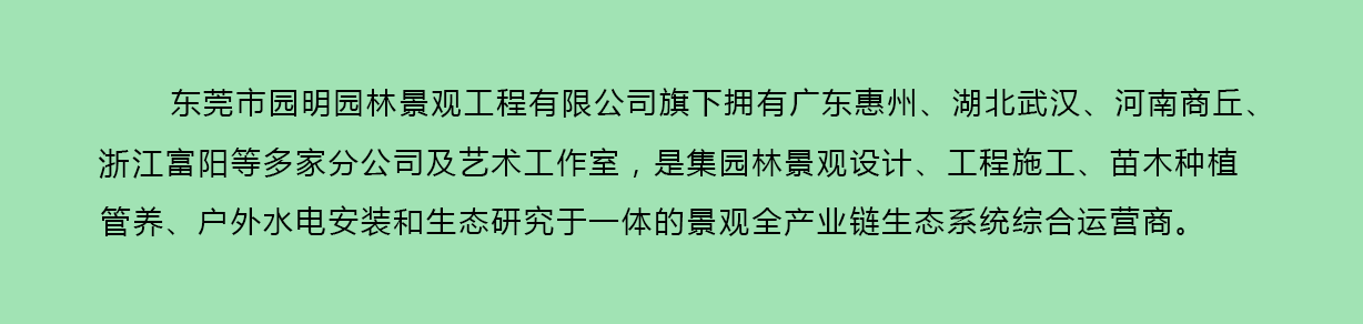 東莞市園明園林景觀工程有限公司旗下擁有廣東惠州、湖武漢、河南商丘、浙江富陽等多家分公司及藝術工作室,是集園林景觀設計、工程施工、苗木種植管養、戶外水電安裝和生態研究于一體的景觀全產業鏈生態系統綜合運營商。